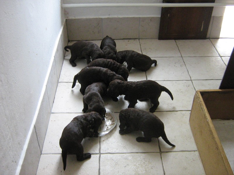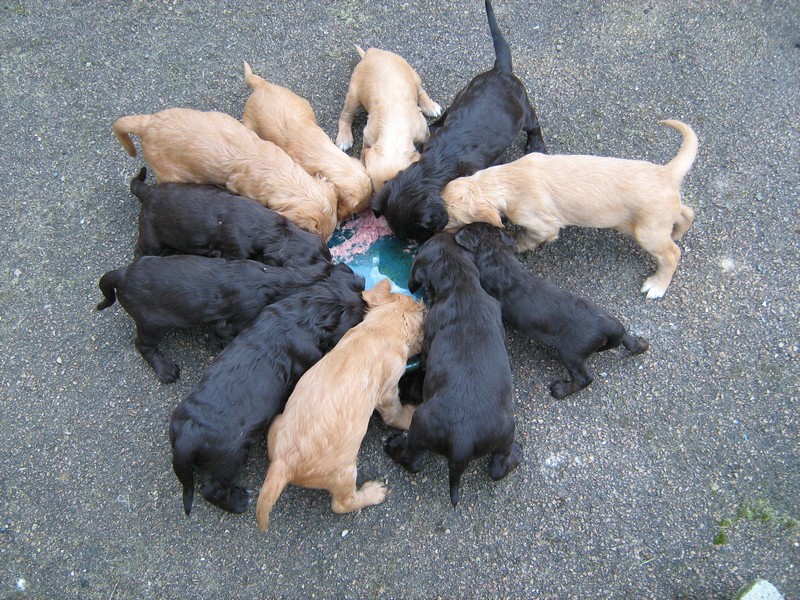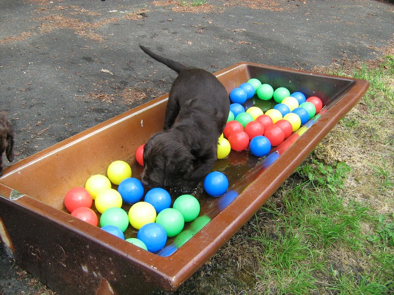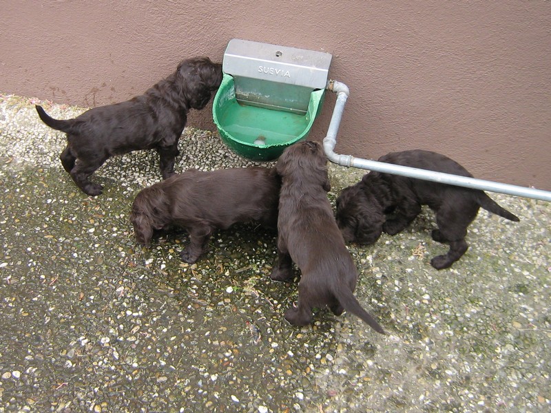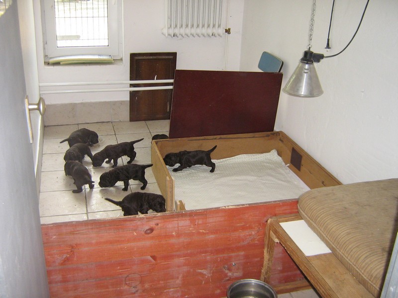 Die Welpen haben ab der vierten Woche ständig freien Zugang nach draussen ins Auslaufgelände, im Sommer wie im Winter. Das fördert die Selbständigkeit, das zurückfinden und auch die Sauberkeit. Bereits mit 4 Wochen gehen die Kleinen nach der Mahlzeit oder nach dem Schlafen nach draussen, um sich zu versäubern. Wenn sie bei schönem Wetter draussen gefüttert werden, finden sie anschliessend alleine den Weg zurück in die warme und trockene Schlafkiste.