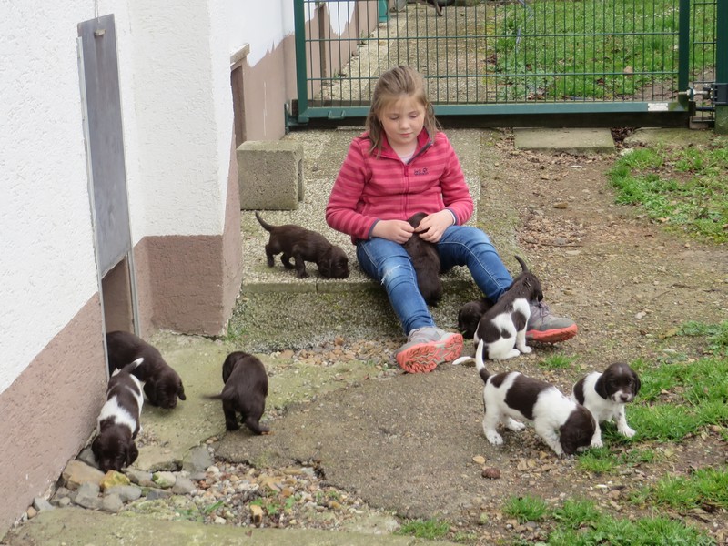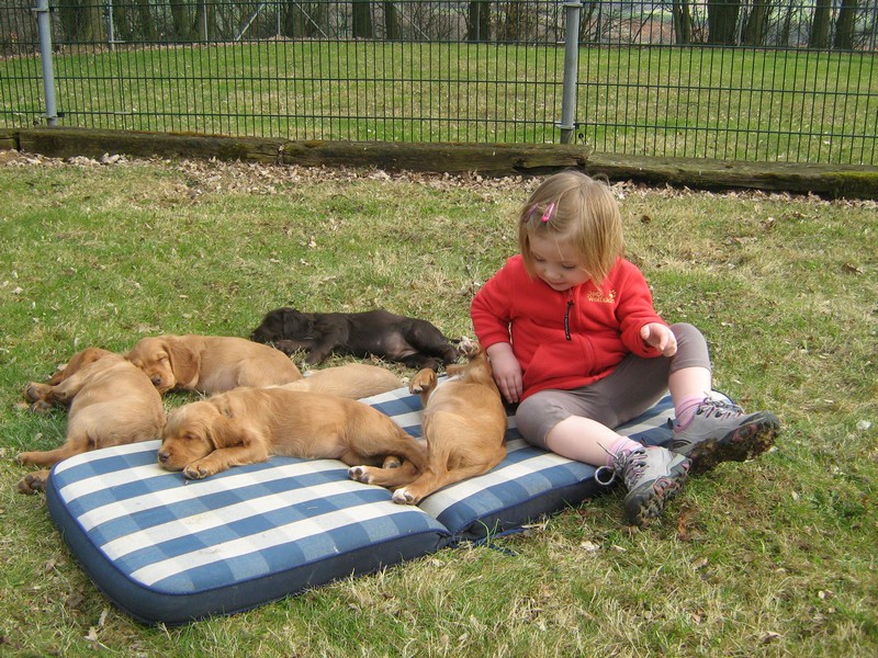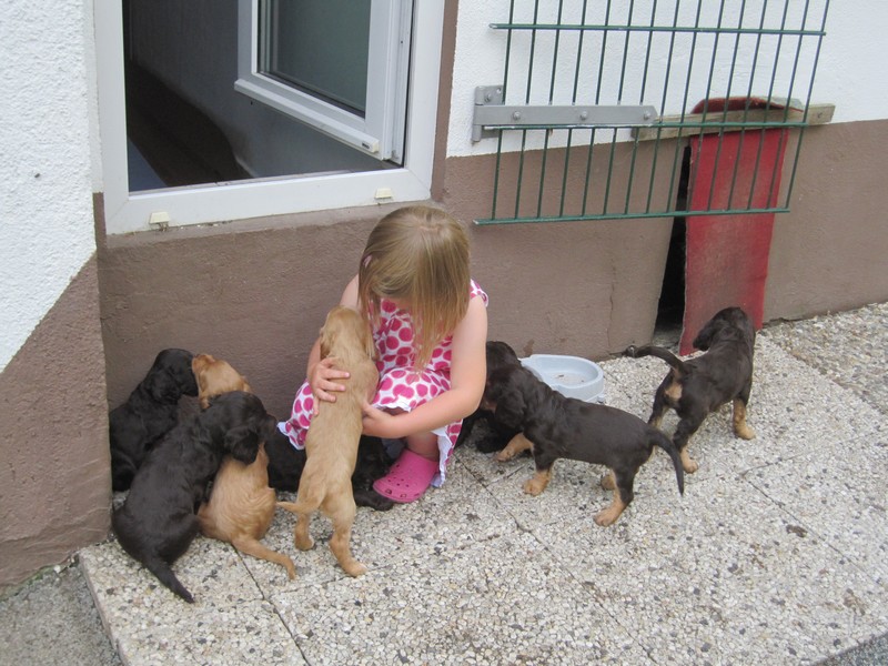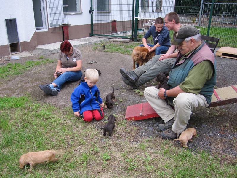 Die Welpen sollen viel von der zukünftigen Umwelt kennenlernen und haben regelmässig Umgang mit verschiedenen Menschen, mit Erwachsenen und Kindern.