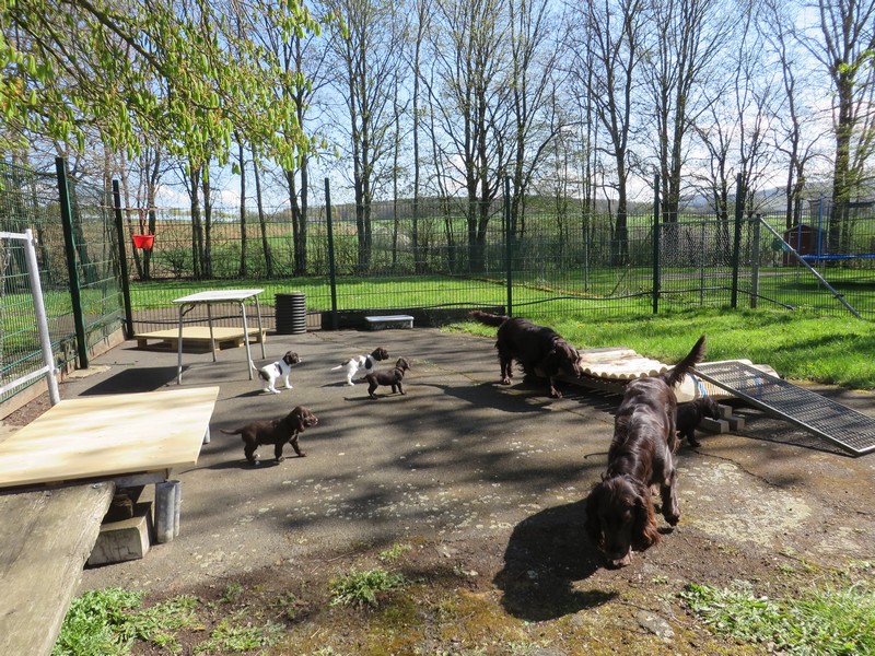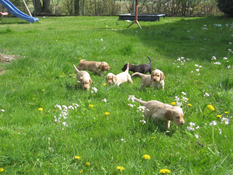 Gabi mit dem J-Wurf auf der Wiese vor dem Zwinger,