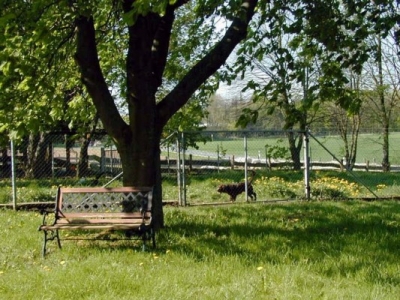 Im Auslaufgelände finden die Hunde unterschiedlichen Boden (Steine, Asphalt, Kies, Grasflächen) und grosse Bäume spenden im Sommer genug Schatten. Spielgeräte für gross und klein werden gern angenommen