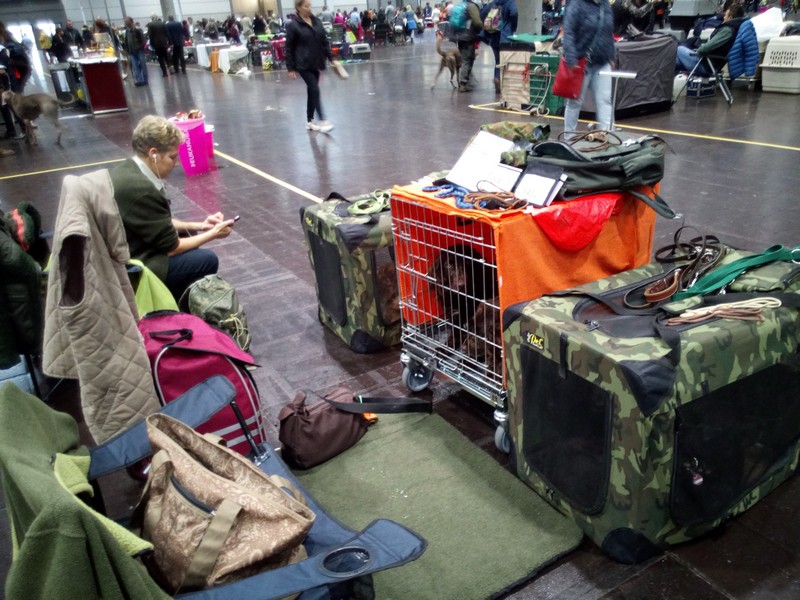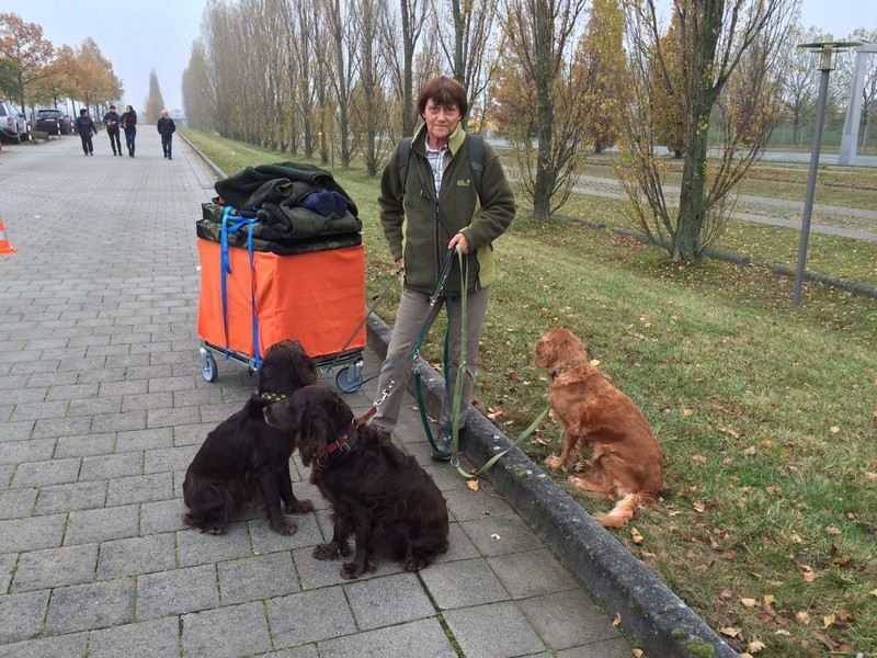 Am Donnerstag früh wurden erst die Hunde ausgeführt und versorgt. Nach ausgiebigem Frühstück fuhren wir zur Messe, wo wir allerdings schon ziemlich weit hinten auf dem Parkplatz eingewiesen wurden. Kein Problem, die Wachtelhunde waren erst um 13:00 Uhr dran und es war jetzt kurz vor neun. Unsere Karawane setzte sich also Richtung Halle 5 in Bewegung. Eine fahrbare Box mit zwei Hunden drin, obendrauf zwei weitere Klappboxen, Stühle und Gepäck gut verzurrt, drei Hunde an der Leine.