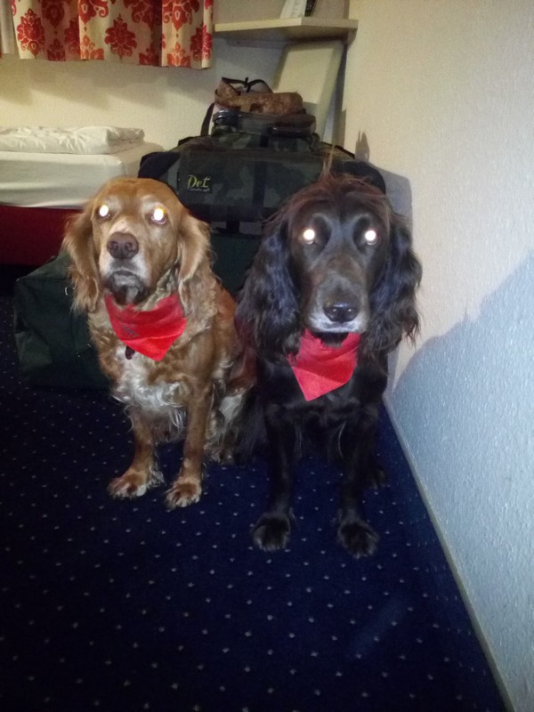 Am Mittwoch Nachmittag ging es mit vollgepacktem Auto los, in Begleitung einer guten Freundin, die einen Weimaraner führt. Im Hotel waren nur zwei Hunde im Zimmer zugelassen, die anderen sollten dann im Auto schlafen. Die Dame an der Rezeption wollte aber genau wissen, wieviele Hunde wir dabei haben – nanu? Wir bekamen für jeden Hund ein Halsband mit Dreieckstuch und für uns Beutelspender für die Gassirunde als Begrüssungsgeschenk. Auch sonst haben wir es mit dem Quartier gut getroffen. Am Stadrand gelegen, war direkt angrenzend ein Spazierweg am Feldrand für die Hunderunde und bis zur Messe sind es nur 3 km.